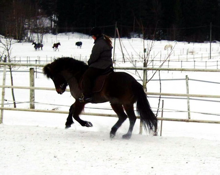 Tindra och jag galopperar för första gången inne på ridbana i januari 2005